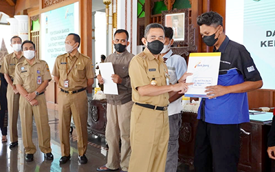 menghadiri penyerahan paket produk UMKM kepada Tenaga Kesehatan (Nakes) yang menangani Covid-19 dan vaksinasi. Momentum ini juga sekaligus digunakan untuk penerimaan secara simbolis rekening virtual account Bantuan Sosial (Bansos) bagi penyandang disabilitas di kabupaten Pati "Saya juga menyampaikan apresiasi kepada Kepala Dinkop dan UMKM beserta jajarannya atas fasilitasnya sehingga kegiatan penyerahan paket produk UMKM kepada tenaga kesehatan yang menangani Covid-19 dan vaksinasi, juga dapat...